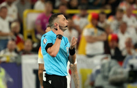 Þýskir stuðningsmenn eru margir hverjir bálreiðir út í Anthony Taylor dómara eftir að hann dæmdi ekki vítaspyrnu þegar Marc Cucurella fékk boltann í hendina í tapi gegn Spáni í 8-liða úrslitum EM síðasta föstudag.