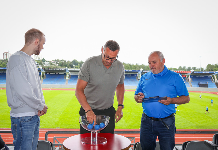 Birkir Sveinsson mótastjóri KSÍ hafði umsjón með drættinum. Jörundur Áki Sveinsson yfirmaður fótboltamála hjá KSÍ sá um að draga ásamt Guðmundi Aðalsteini Ásgeirssyni fréttamanni Fótbolta.net.