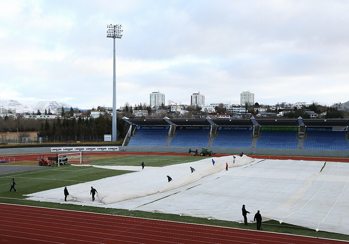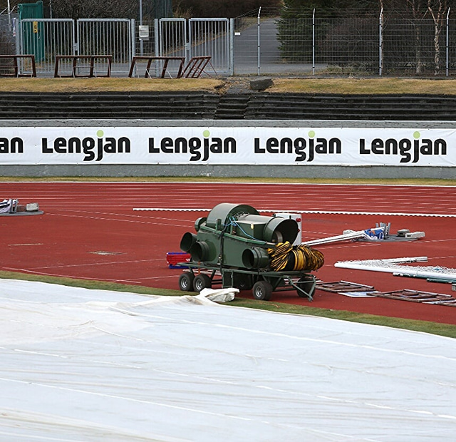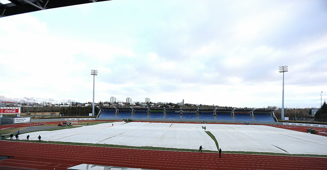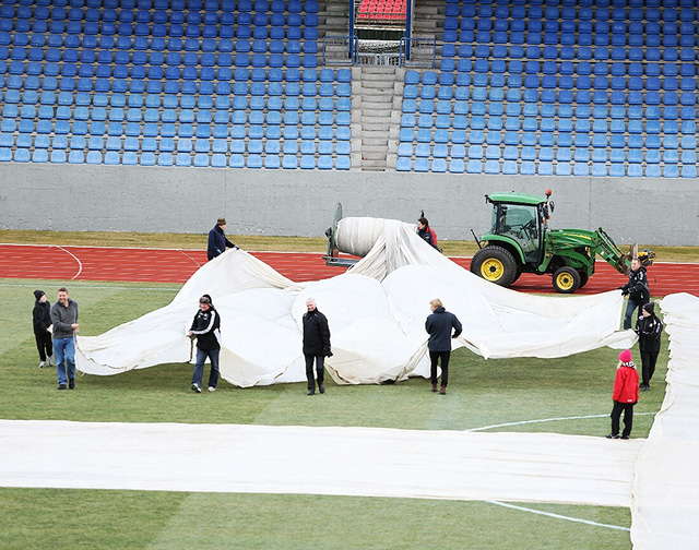 Þessa stundina stendur vinna yfir á Laugardalsvelli þar sem verið er að leggja hitadúk yfir völlinn.