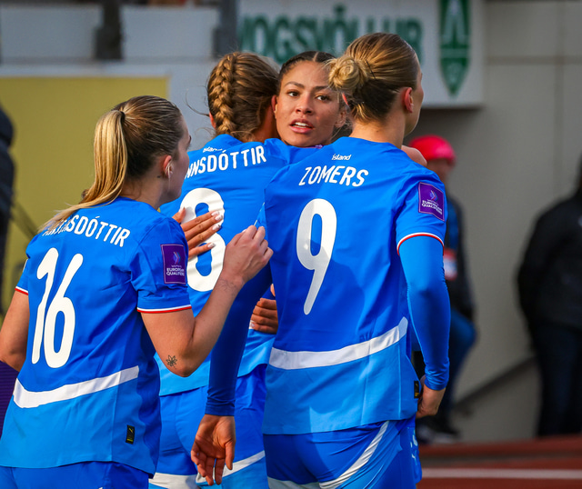 Ísland spilar aftur í heimabúningnum aftur á eftir er þær mæta Þýskalandi en það verður fróðlegt að sjá hvernig útibúningurinn kemur út þegar hann verður frumsýndur.