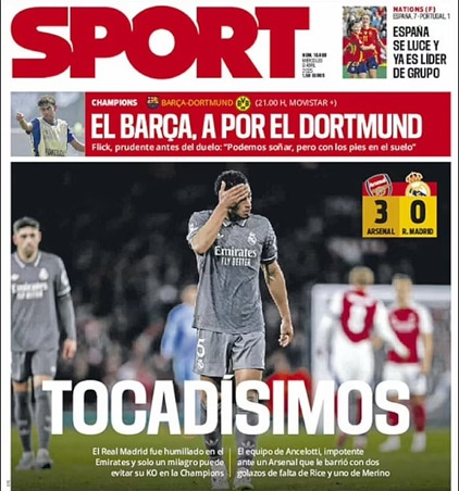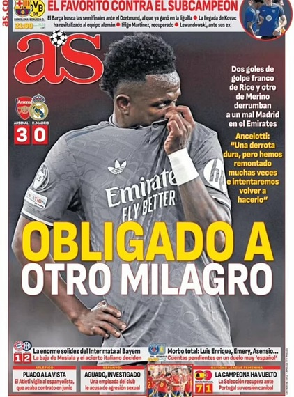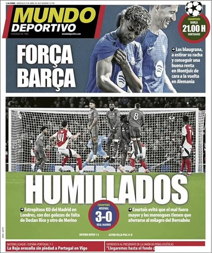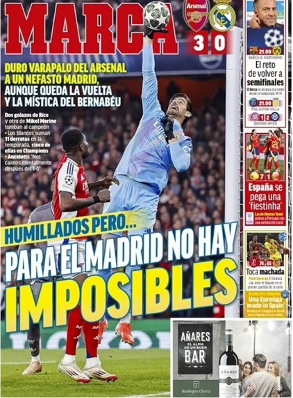 'Humillados Pero... Para El Madrid No Hay Imposibles' sagði á forsíðu Marca en það þýðist sem 'Niðurlægðir en... fyrir Madrid er ekkert ómögulegt'.