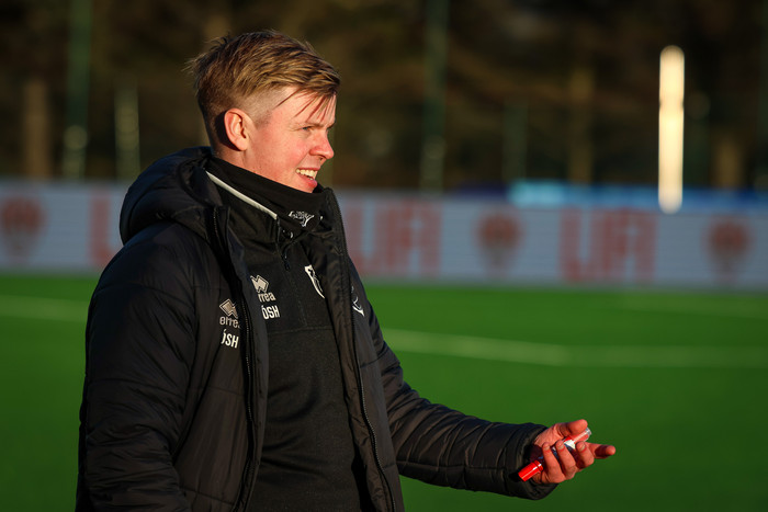 Veðrið sýndi á sér margar ólíkar hliðar í kvöld, sólin skein á köflum en inn á milli voru aðstæður frekar erfiðar. „Ég labbaði hérna út og þá var sólskin og svo kom maður út og þá var kominn snjóstormur. Ég held það hafi sést á 93. mínútu þá kom bara eins mikið haglél og ég hef séð frá því í nóvember í fyrra á miðjum vetri. Mér fannst stelpurnar díla frábærlega við það," sagði Óskar Smári.