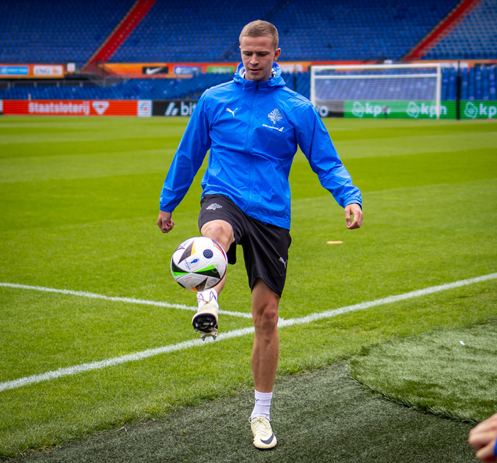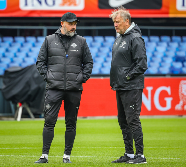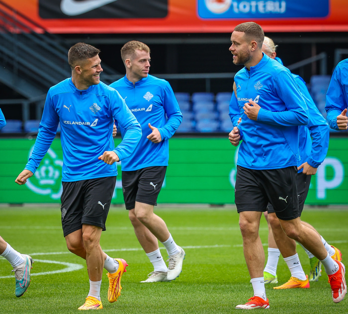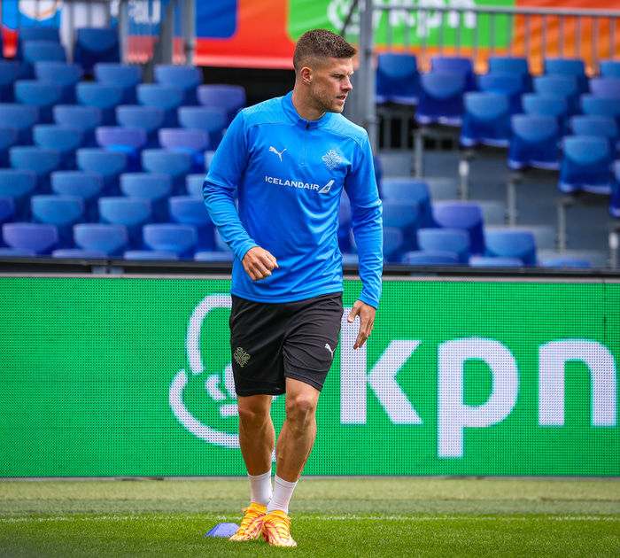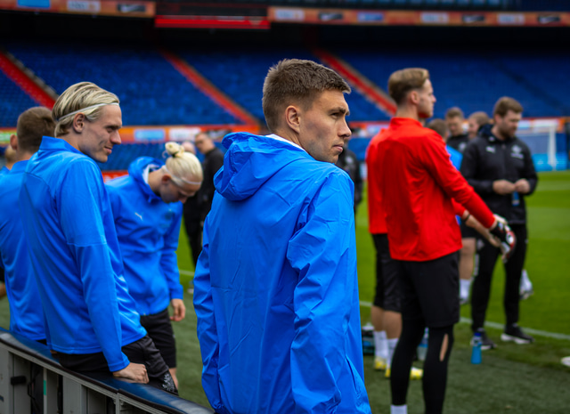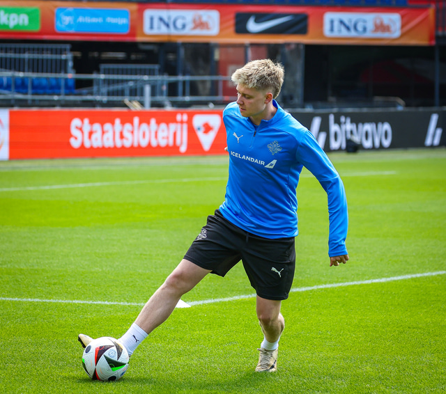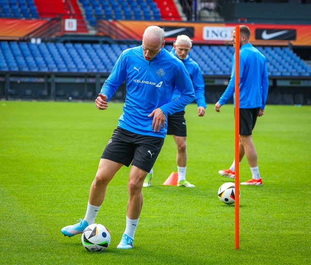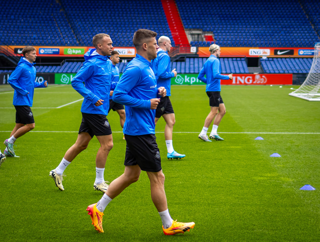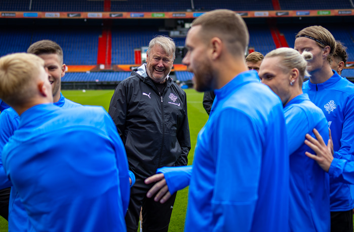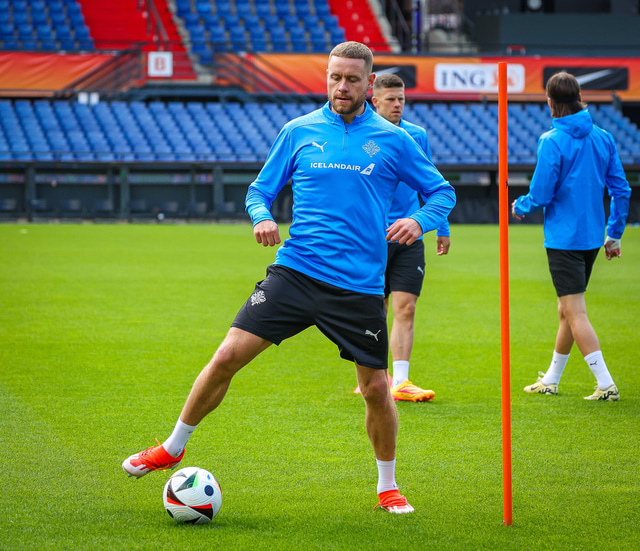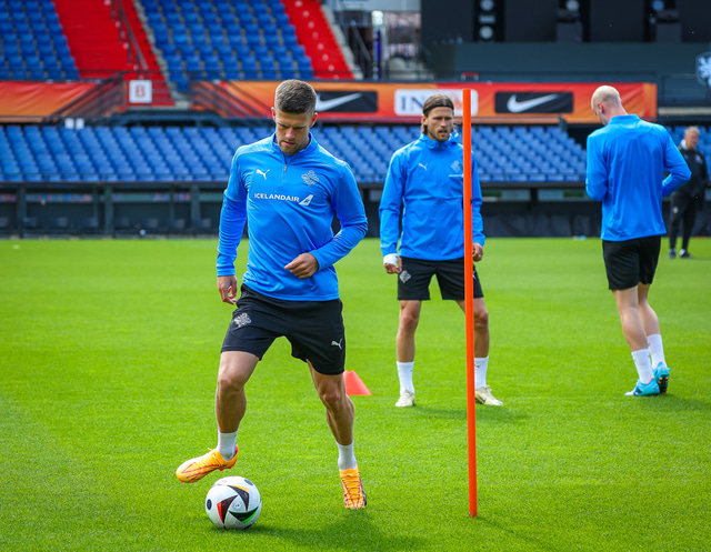 Íslenska landsliðið er í þessum skrifuðu orðum að æfa á De Kuip leikvangnum í Rotterdam þar sem leikið verður gegn Hollandi á morgun.