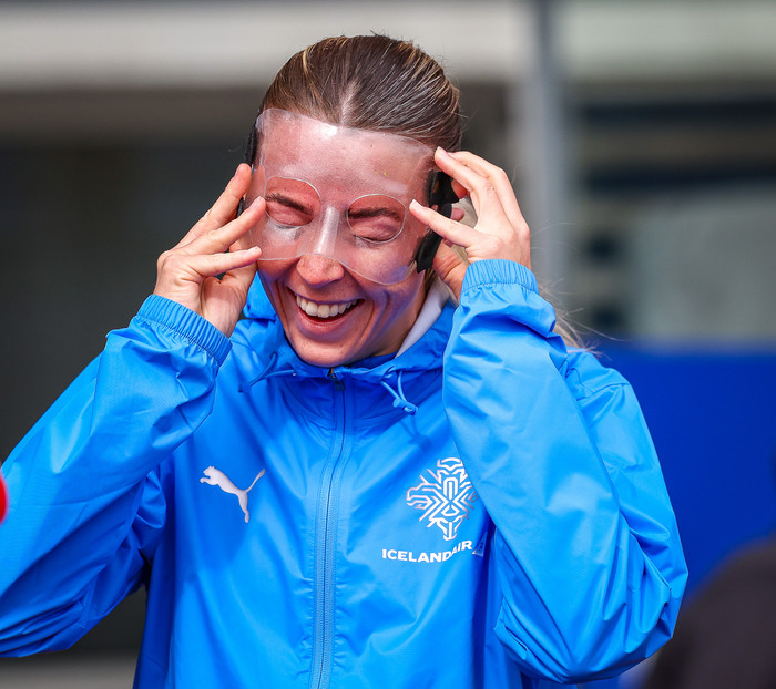 Hún fór reyndar í öðruvísi tilraunir á æfingu Íslands í morgun þegar hún reyndi að leika Kylian Mbappé og setja á sig grímu fyrir æfinguna.