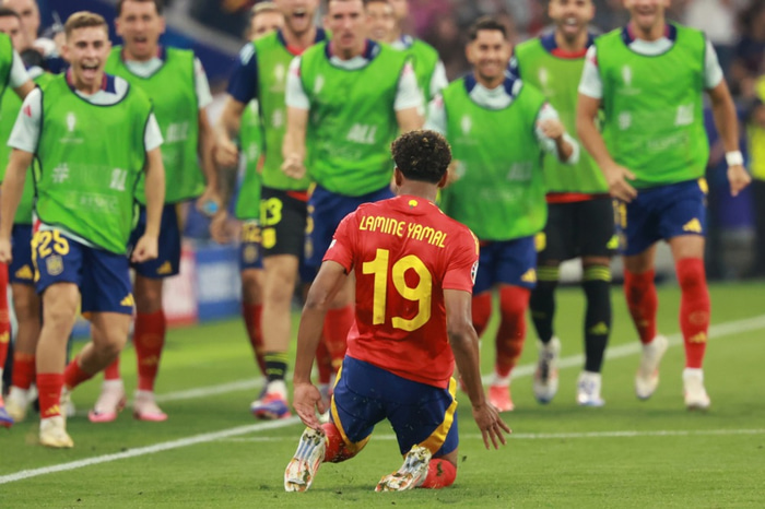 Spánverjarnir svöruðu marki Frakka vel. Á 21. mínútu skoraði Lamine Yamal stórbrotið mark, hans fyrsta á mótinu og varð um leið yngsti markaskorari í sögu Evrópumótsins.