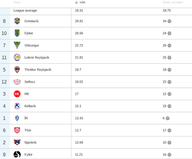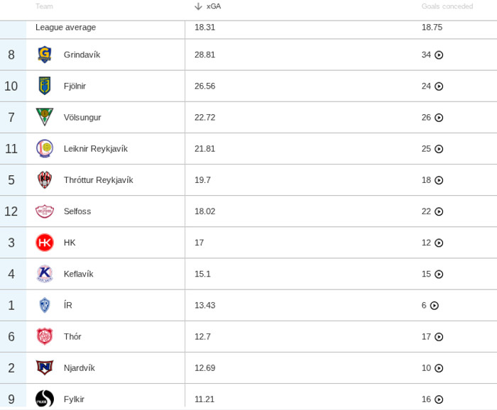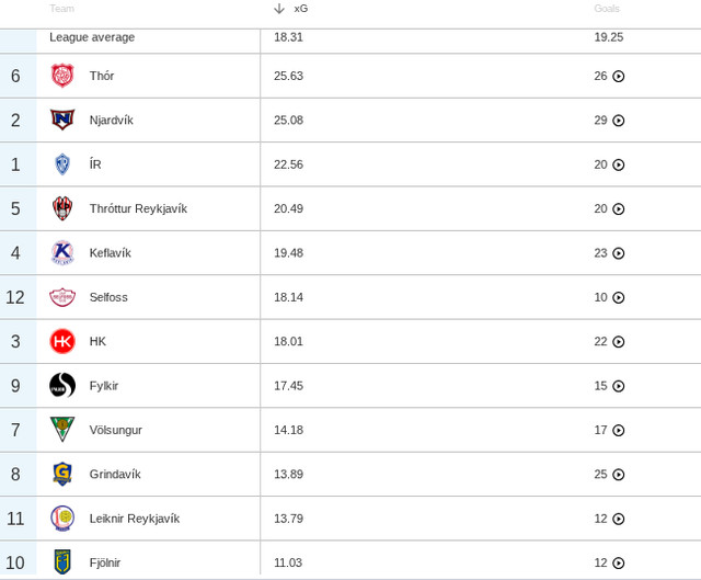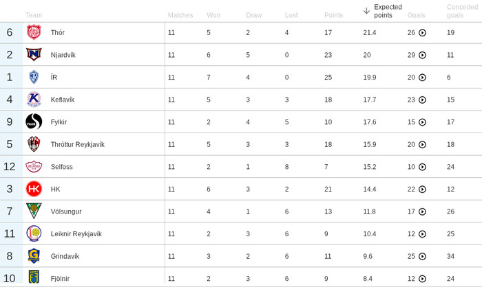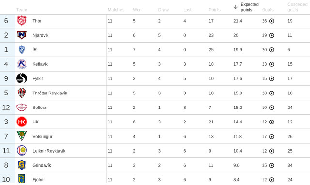 Það er næst mesti munurinn í deildinni því mesti munurinn er hjá botnliði Selfossi sem er með 8,2 stigum minna. Selfoss ætti miðað við tölfræðina að vera í 7. sæti. Mesti munurinn á eftir Selfossi og Fylki er svo hjá HK sem er með 6,6 stig um fram xPts og svo er ÍR sem er með 5,1 stigi meira en tölfræðin segir til um.