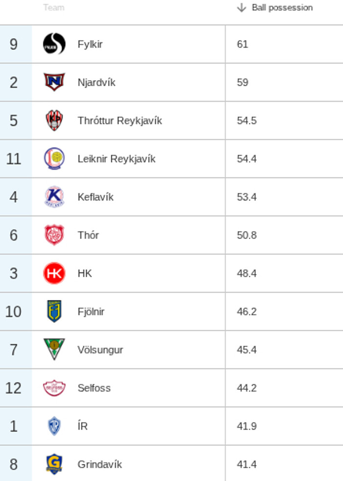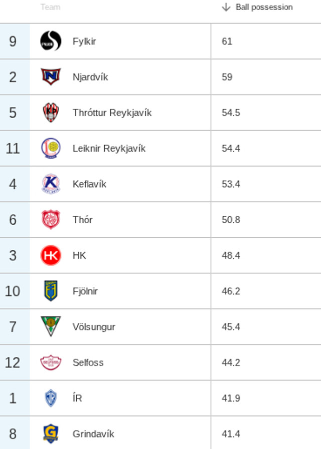 Þau lið sem halda boltanum mest eru Fylkir og Njarðvík. Þau tvö lið sem halda minnst í boltann eru svo ÍR og Grindavík. Fylkir er 61% með boltann í sínum leikjum, en sem dæmi er það 5,3% minna en KR sem heldur boltanum langmest í Bestu deildinni. Víkingur er í 2. sæti í Bestu deildinni með 56,4% possession.