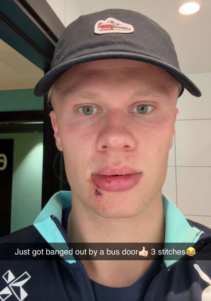 Erling Haaland þurfti að láta sauma þrjú spor í vörina eftir að hurð á liðsrútu Noregs skall framan í hann í gær.