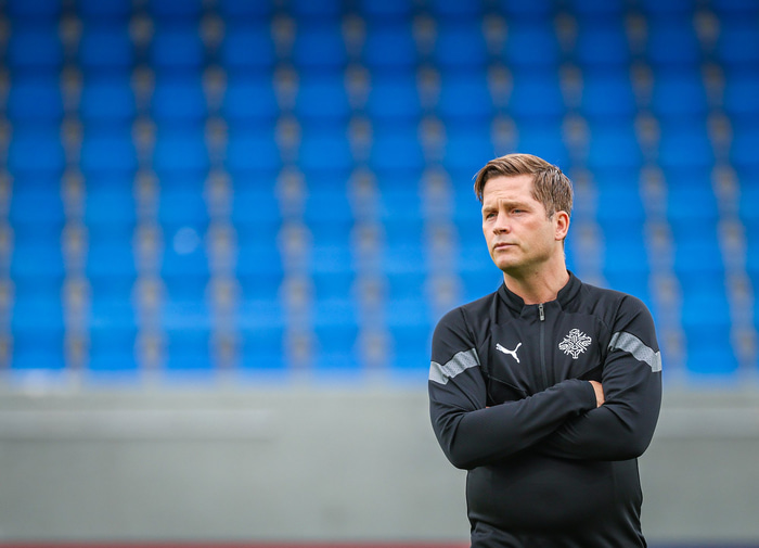 „Nei, ég hef alltaf séð hann fyrir mér að taka við stóru liði á Íslandi. Hann er með skemmtilegan fótbolta úti og þeir eru í efsta sæti. Ef hann fær lið hérna á Íslandi sem á að vera í toppbaráttu, þá held ég að hann geri mjög vel.“