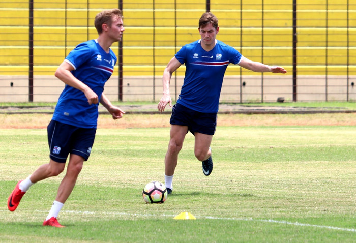 „Þetta hafa verið fínar æfingar, allir með og enginn meiddur. Við þjálfararnir erum mjög ánægðir með strákana á þessum æfingum. Svo sjáum við hvernig orkan í mönnum verður í leiknum á morgun en það er mjög auðvelt að tapa orku í svona veðri," segir Heimir.