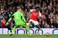 Leikar enduðu 2-2 í þessari fyrri viðureign en undir lokin vildi Arsenal fá vítaspyrnu þegar Bukay Saka fór niður í teignum eftir snertingu við Manuel Neuer markvörð Bæjara.