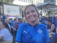 Stuðningsmannasvæðið í Thun í dag átti að vera fyrir bæði lið en þarna voru bara bláar treyjur. Það var svipuð stemning fyrir fyrsta leik gegn Finnlandi hér í Thun en ögn erfiðara á stuðningsmannasvæðinu fyrir leikinn gegn heimakonur í Sviss.