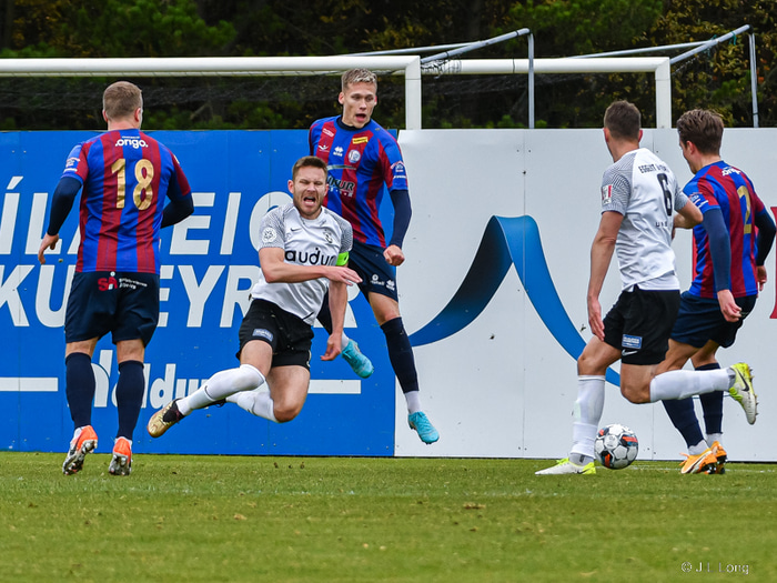 Á 16. mínútu fékk Gyrðir dæmt á sig víti eftir baráttu við Matthías í teignum. Hann skilur ekkert í dómgæslunni.
