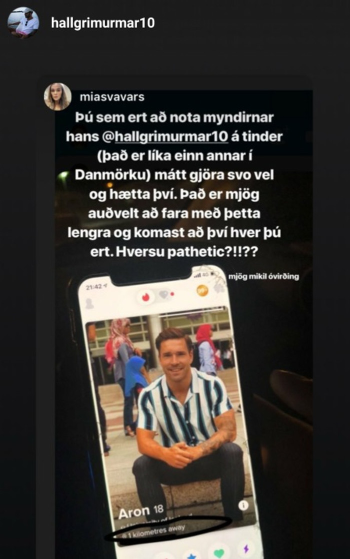 „Þetta er í annað skiptið sem að þetta gerist. Það var einhver meistari í Danmörku búinn að gera sér Tinder aðgang og nota fullt af myndunum mínum á Instagram, strákur sem kallar sig Rasmus."