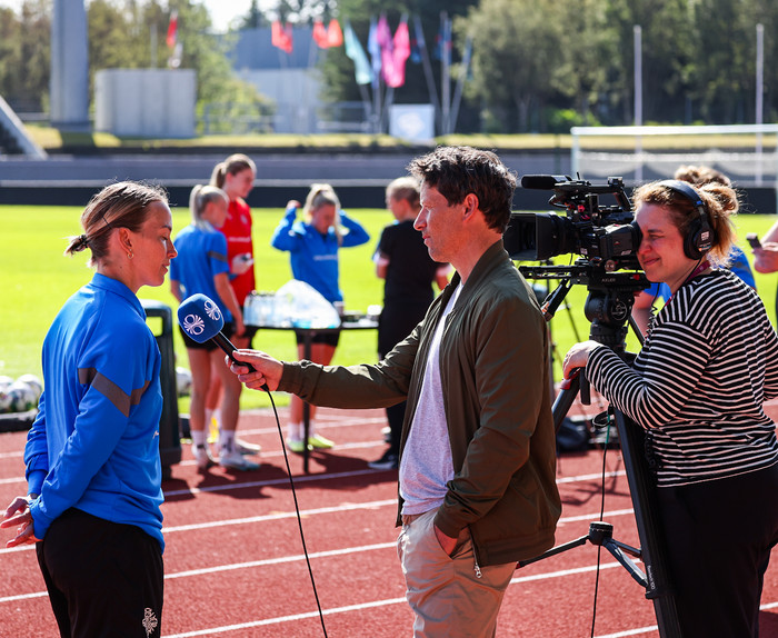 „Mér finnst það bara geggjað og vonandi peppar það kvennafótbolta yfir höfuð. Ég held það sé frábært líka fyrir okkur, við viljum hafa áhrif á yngri kynslóðina og vera fyrirmyndir fyrir þær. En svo gefa þær okkur líka ofboðslega mikið, orkan sem kemur frá ungdóminum er frábær."