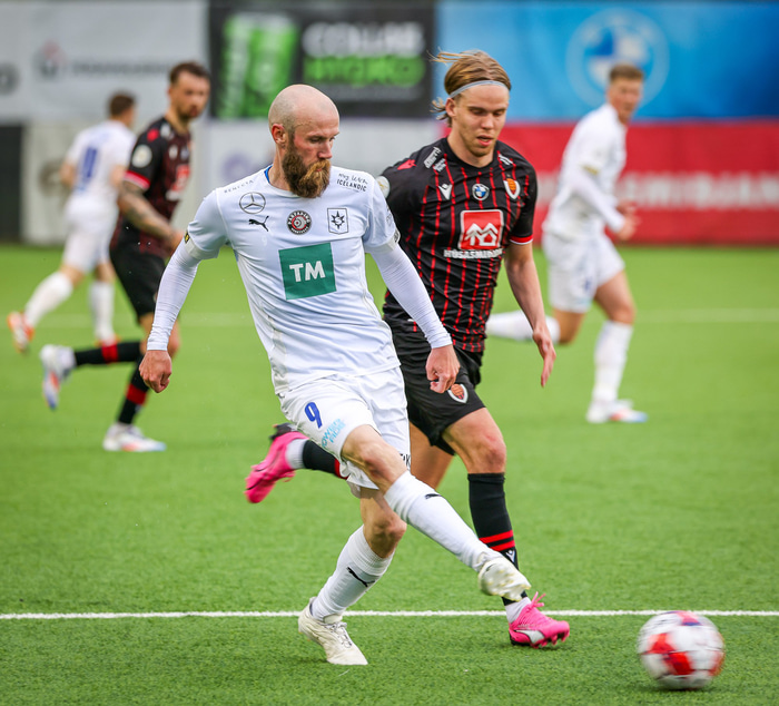 „Mér fannst eins og Kjartan var tekinn niður en ég sá það ekki alveg. En það mátti taka Kjartan ansi oft niður í dag. Þetta var bara eitt af þeim sjö átta skiptum þar sem hann var tekinn niður og yfirleitt ekkert dæmt. Hitt fór í hendina en ég sá ekki hvað gerðist á undan.“
