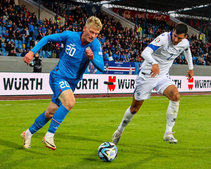 Orri Steinn Óskarsson kom nokkuð óvænt inn í byrjunarlið Íslands gegn Bosníu í kvöld. Þessi efnilegi sóknarmaður kom sterkur inn í liðið og skilaði sínu vel.
