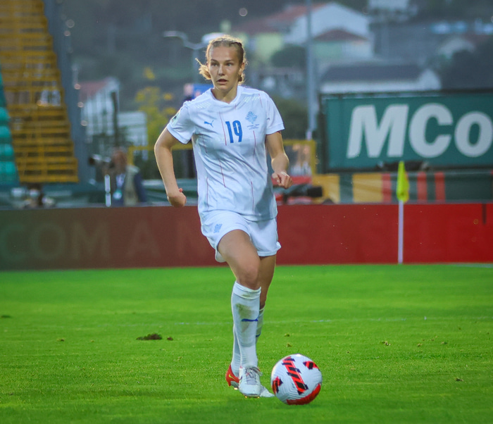 Rauða spjaldið fékk Áslaug fyrir að fara aftan í Jessicu Silva, leikmann portúgalska liðsins og vítaspyrna dæmd.