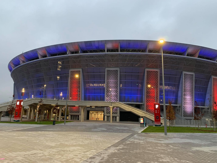 Fulltrúar Fótbolta.net eru mættir á leikvanginn en hann er í fánalitum Íslands eins og sjá má hér til tliðar.