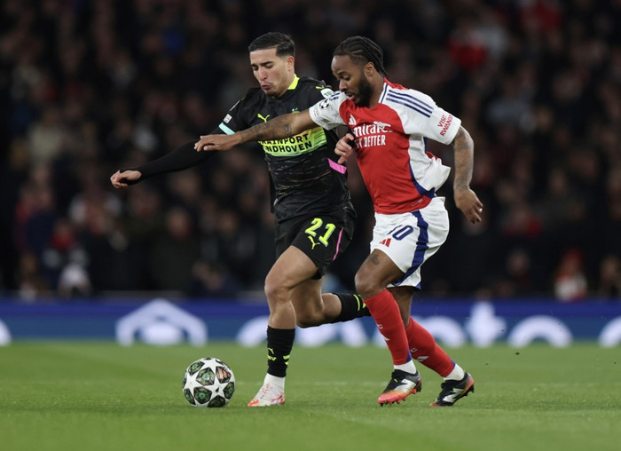 Arsenal var komið með níu tær í 8-liða úrslitin eftir 7-1 sigur gegn PSV í Hollandi. Raheem Sterling fékk tækifærið í byrjunarliðinu í kvöld og lagði upp bæði mörk liðsins í jafntefli.