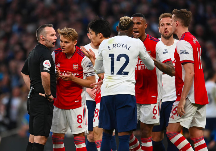 Arsenal byrjaði leikinn aðeins betur en Tottenham vann sig í hann áður en liðið fékk víti á 22. mínútu. Dejan Kulusevski kom með boltann fyrir markið og var Son keyrður niður af þeim Cedric Soares og Holding. Harry Kane steig á punktinn, dró inn andann í tvígang áður en hann skoraði af öryggi.