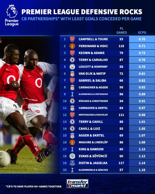 Aðeins miðvarðapör sem hafa spilað 50 úrvalsdeildarleiki eða fleiri saman koma til greina og eru tvö nútíma miðvarðapör sem komast fyrir á listann. Þar er um að ræða William Saliba og Gabriel, sem hafa spilað 66 úrvalsdeildarleiki saman og fengið að meðaltali 0,82 mörk á sig á leik. Þeir eru í sjöunda sæti yfir þau miðvarðapör sem hafa fengið fæst mörk á sig í sögu deildarinnar.