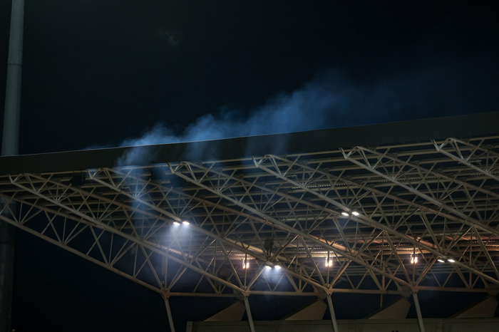 Það var þó ekki svo að ekki hafi verið ský yfir Laugardalsvelli því manngerð þoka vofði yfir vellinum á meðan á leiknum stóð.