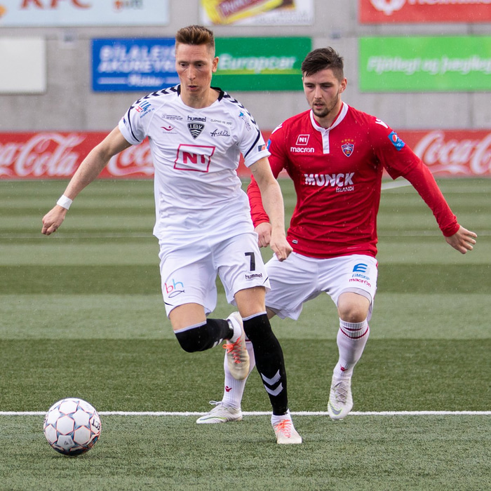 Í sumar skoraði Kaj Leó tvö glæsileg mörk gegn Val á Origo-vellinum, eitt í Mjólkurbikarnum og eitt í Pepsi-deildinni.