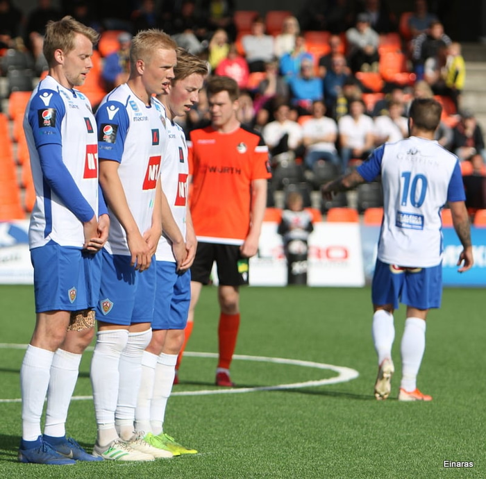 Í fyrra lék KA í hvítum og bláum treyjum eins og má sjá á myndinni í þessari frétt. Hér að neðan má hins vegar sjá nýjan varabúning félagsins.