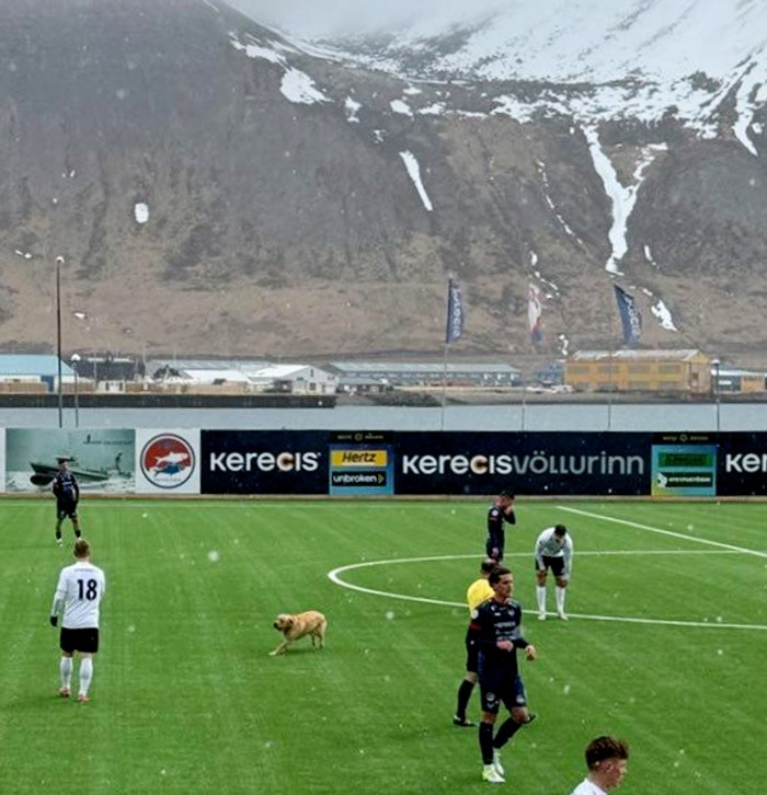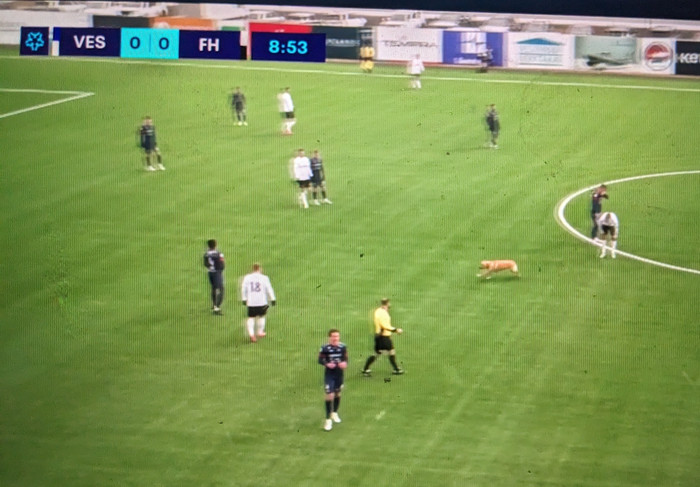 „FH-ingar aðeins að taka völdin þegar gulur Labrador fær nóg og hleypur inn á völlinn," skrifaði Hákon Dagur Guðjónsson í beinni textalýsingu frá leik Vestra og FH í Bestu deildinni.