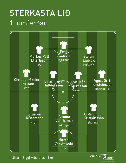 Gylfi Þór Sigurðsson skoraði jöfnunarmark Íslandsmeistara Víkings gegn Breiðabliki í opnunarleiknum sem endaði 1-1. Ágúst Orri Þorsteinsson lagði upp mark Blika og var besti leikmaður Kópavogsliðsins. Gunnar Vatnhamar er í vörn úrvalsliðsins.