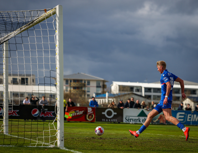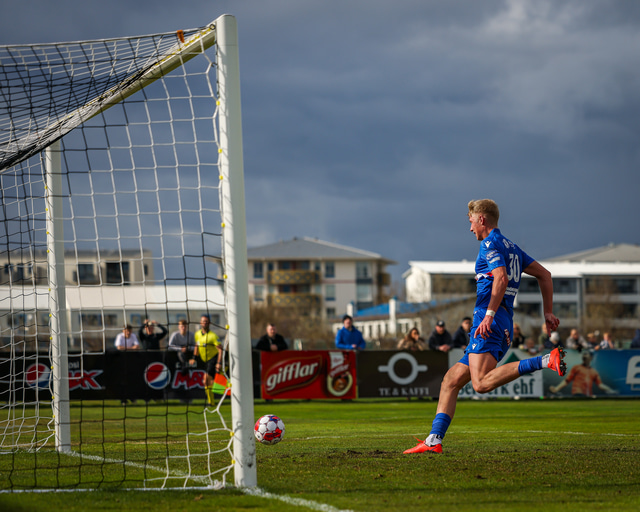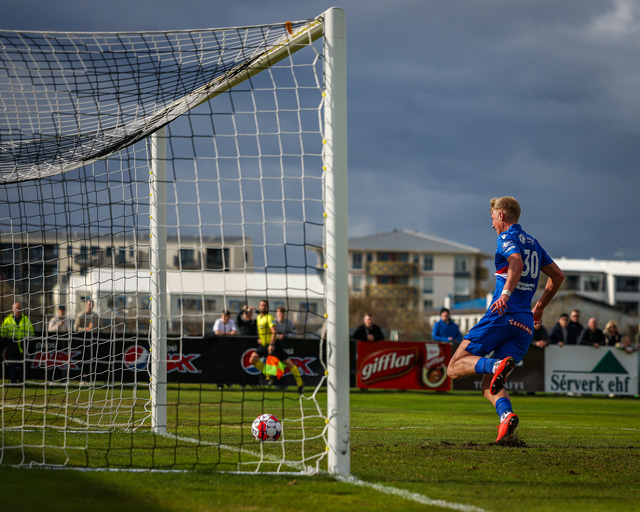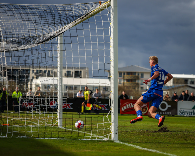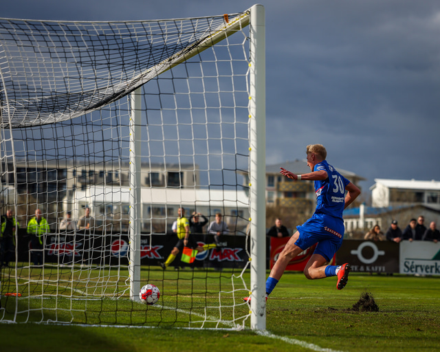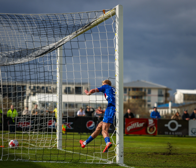 Liðsfélagar Atla hjá HK náðu ekki að fagna markinu innilega með honum því hann lá meiddur í kjölfar þess að hann kom boltanum í netið.