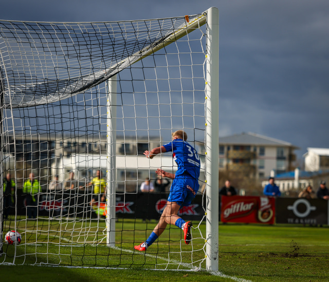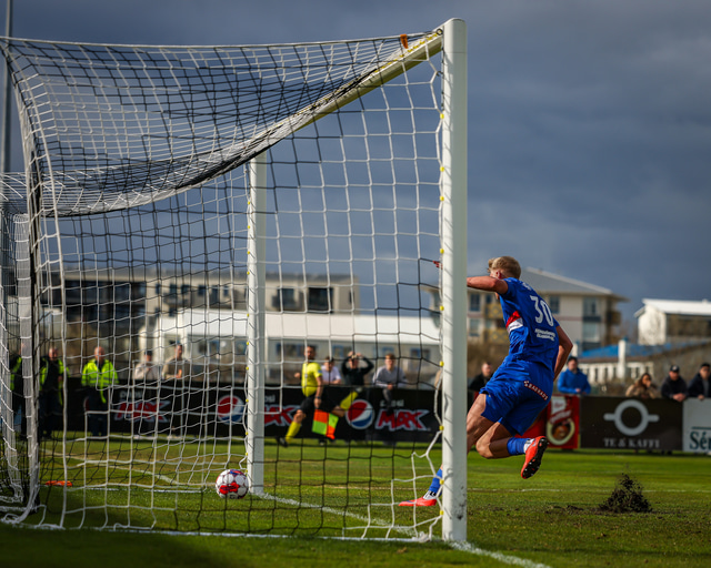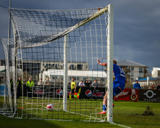 Á meðfylgjandi myndum af því þegar Atli skorar virðist sem hann stígi í holu í teignum rétt eftir að hafa rennt boltanum í átt að tómu markinu og misst fæturna og stór sandstrókur gaus upp úr vellinum. Atli varð í kjölfarið að fara af velli meiddur.