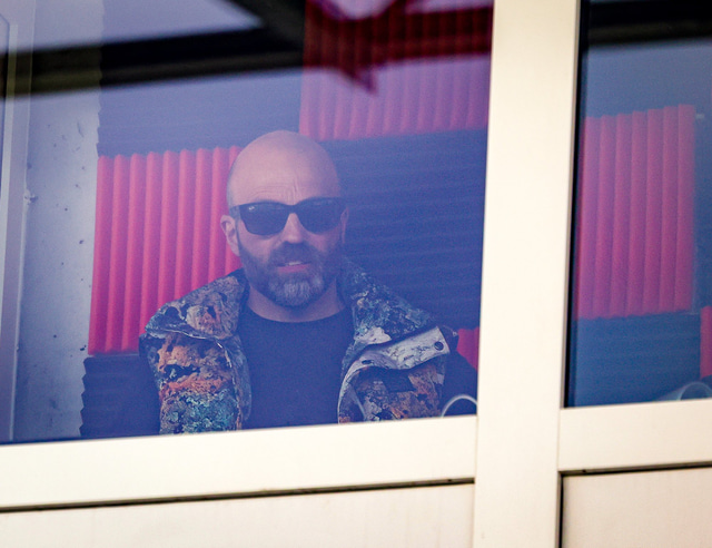 Á myndunum er Arnar að fylgjast með leiknum í búrinu.