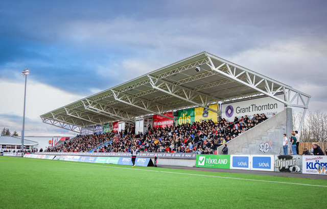 Að þessu sinni hafði Arnar ekkert samband við aðstoðarmenn sína á bekknum heldur kom hann sér fyrir í lokuðu rými efst í stúkunni við hlið vallarþularins í Víkinni.