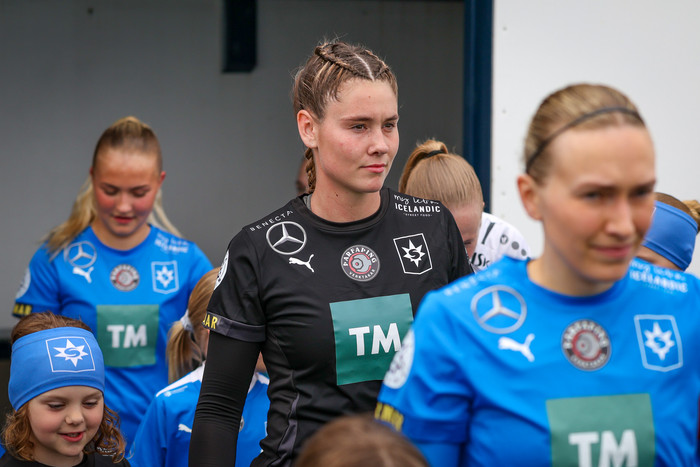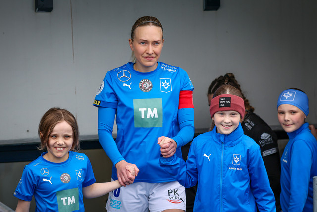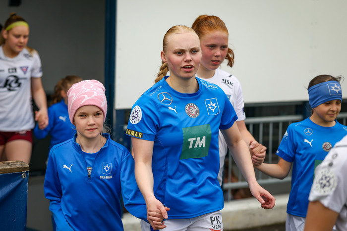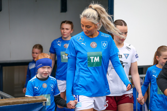 Það var skemmtilegt augnablik fyrir leik Stjörnunnar og Tindastóls í Mjólkurbikarnum í gær þegar liðin voru að ganga inn á völlinn.