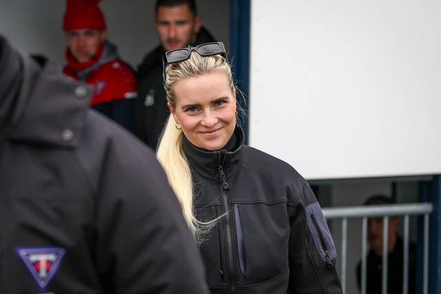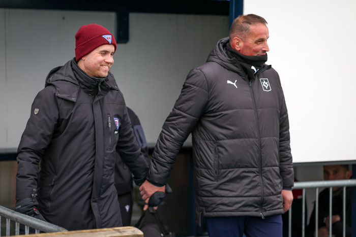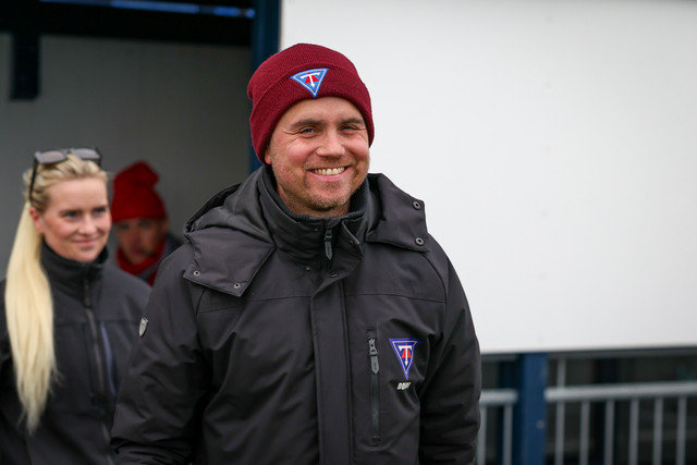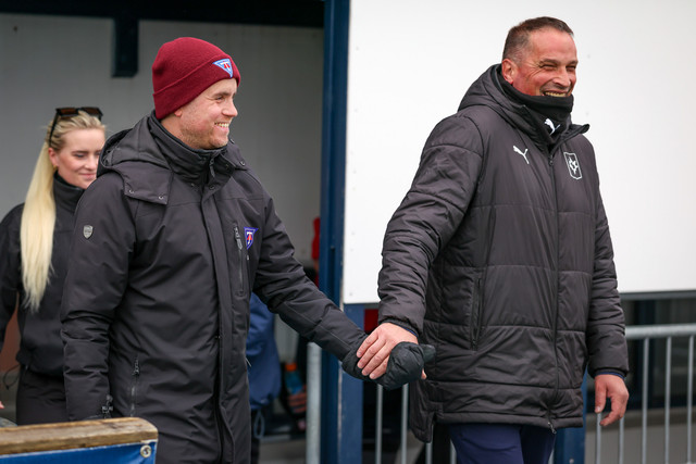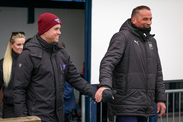 Þeir Halldór Jón sigurðsson - Donni - sem er þjálfari Tindastóls, og Rajko Stanisic, sem er markmannsþjálfari Stjörnunnar, tóku upp á því að leiðast inn á völlinn. Myndir sem Hafliði Breiðfjörð tók í gær má sjá hér við fréttina.