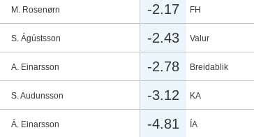 Þeir Halldór Snær Georgsson hjá KR og Jökull Andrésson Afturelding eru nokkurn veginn á pari. Árni Marinó Einarsson hjá ÍA er með verstu tölfræðina, hefur fengið á sig 4,81 mark um fram þau sem hann hefði átt að fá á sig. Steinþór Már Auðunsson hjá KA er með -3,12, Anton Ari Einarsson hjá Breiðabliki er með -2,78, Stefán Þór Ágústsson sem varði mark Vals fyrir komu Frederiks er með -2,43, Mathias Rosenörn hjá FH er með -2,17 og Ingvar Jónsson hjá Víkingi er með -1,37.