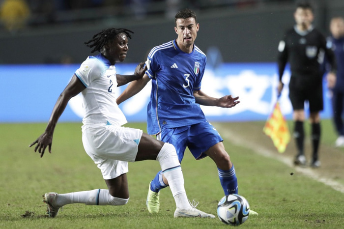 Norton-Cuffy í leik með U20 landsliði Englands gegn U20 landsliði Ítalíu. Hann er hér í baráttu við Riccardo Turicchia, leikmann Juventus.