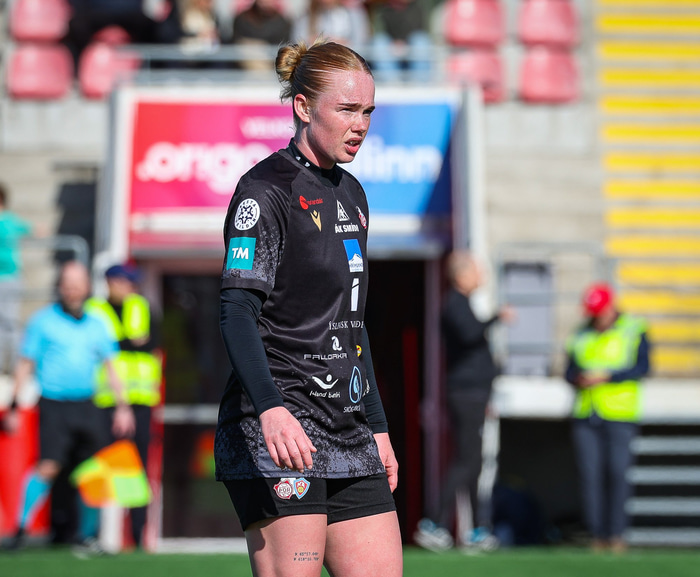 „Sólin hefur alveg töluverð áhrif, ef þú horfir upp í loftið á móti sólinni þá blindastu. Mér leið annars bara vel á vellinum. Það er mjög solid að vera með þessar stelpur í kringum mig og góðan markmann. Mér fannst við smá stressaðar í byrun en urðum svo frekar yfirvegaðar þegar leið á leikinn."