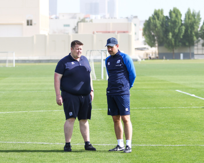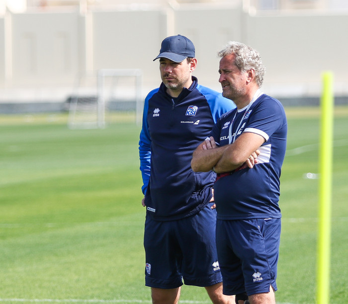 Erik Hamren, landsliðsþjálfari, og Freyr hafa séð marga nýja leikmenn á æfingum í Katar og eru ánægðir með ferðina hingað til.