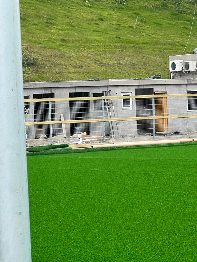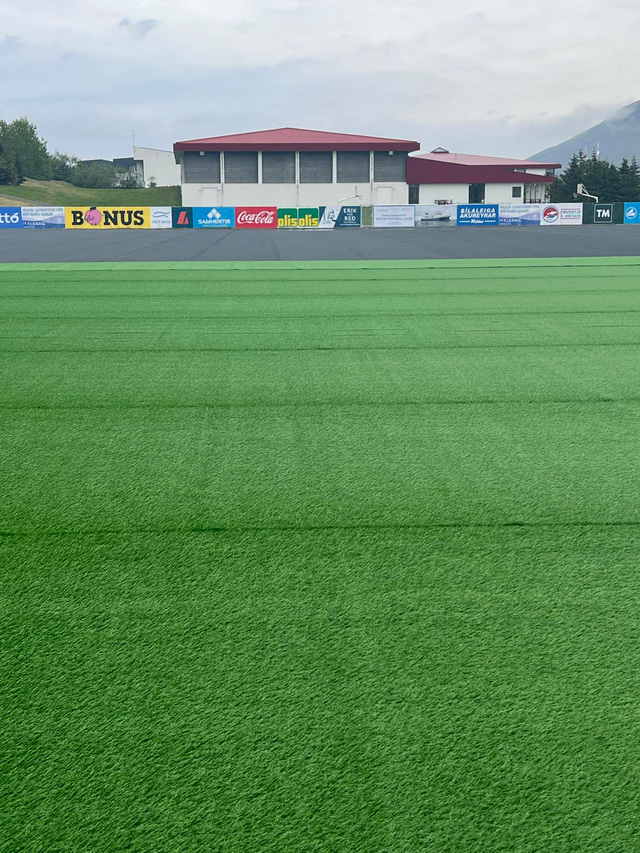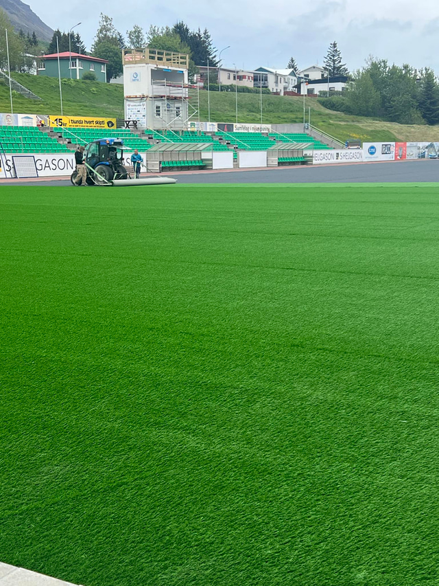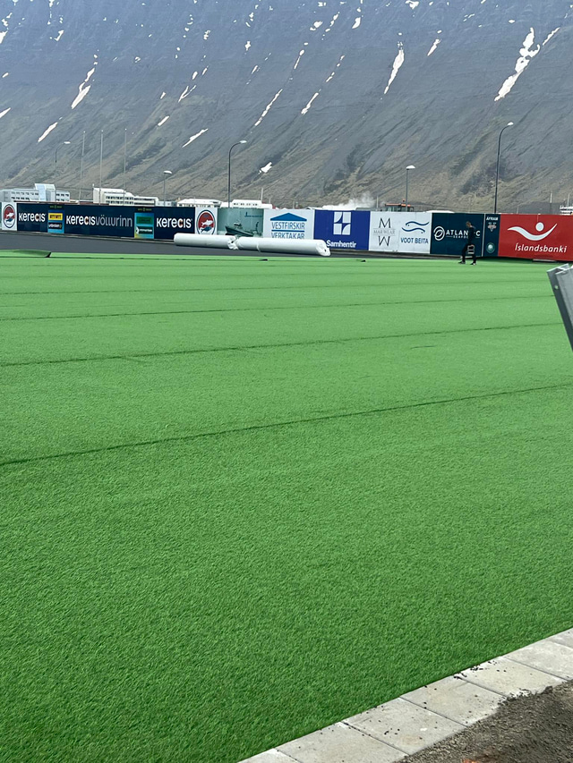 Nú er verið að leggja gervigras á keppnisvöll Vestra og er búið að leggja það á þriðjung vallarins. Það stefnir í að það verði búið að klára framkvæmdirnar á þriðjudag og miðvikudag og stefnt er að því að Vestri geti æft á vellinum á fimmtudag.