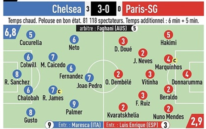 Franska blaðið L'Equipe valdi að sjálfsögðu Cole Palmer sem mann leiksins, hann fékk 9 af 10 mögulegum. Palmer skoraði tvö mörk í fyrri hálfleik en Chelsea leiddi 3-0 í leikhléi, sem urðu svo lokatölur leiksins.