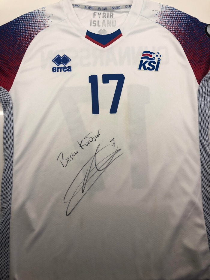 Aron Einar Gunnarsson er með áritaða Íslenska Landsliðstreyju á lottó uppboði ágóði mun skiptast milli Minningarsjóðs Baldvins Rúnarssonar og Hetjurnar Félag Langveikra Barna á Norðurlandi.
