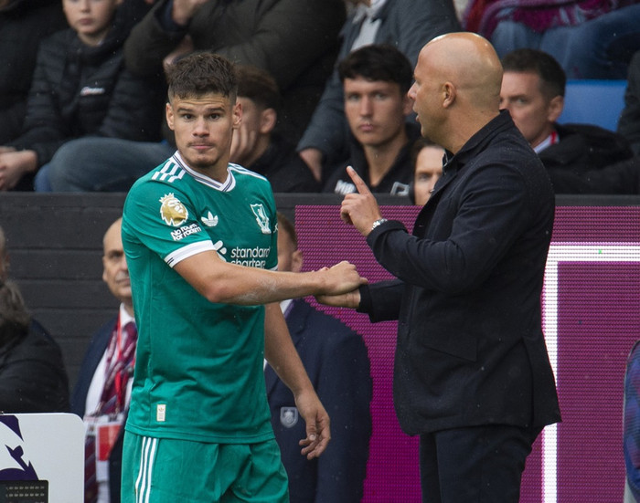 Milos Kerkez, bakvörður Liverpool, sá því næst gula spjaldið fyrir dýfu í vítateig Burnley og var hann tekinn af velli þegar lítið var eftir af hálfleiknum. Arne Slot þorði ekki að taka neina sénsa og setti því Andy Robertson inn á.