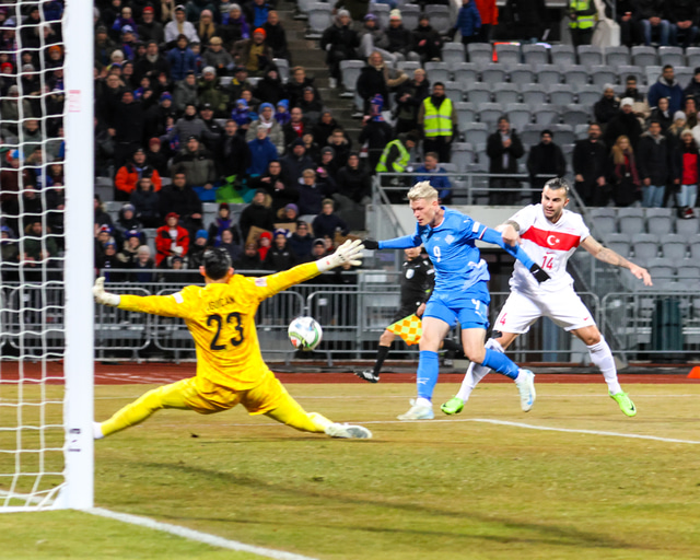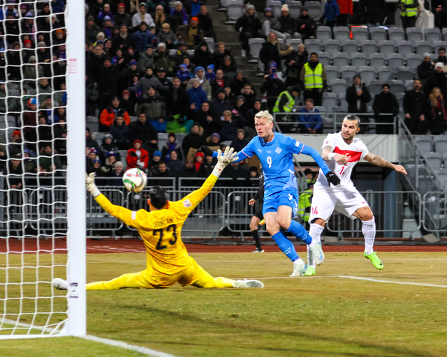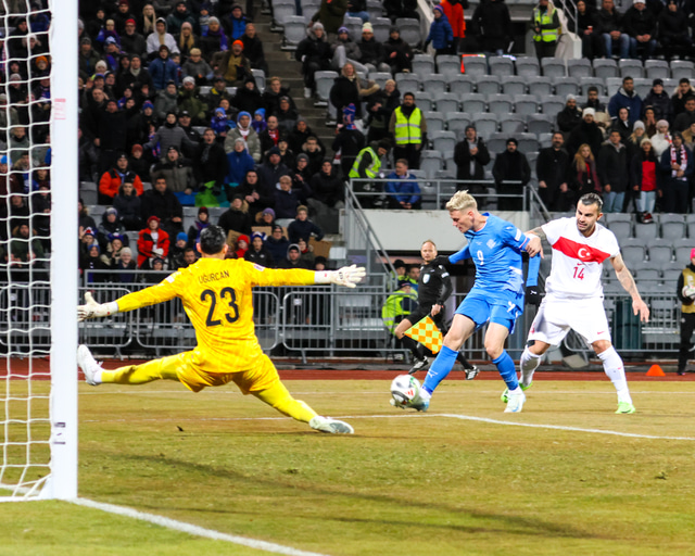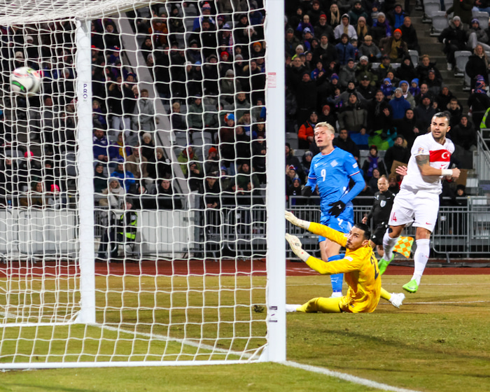 Hann náði að halda varnarmanni fyrir Tyrkjana og þegar hann kom nálægt markteignum lét hann vaða og skaut yfir markvörð Tyrkjanna sem reyndi að loka markinu.