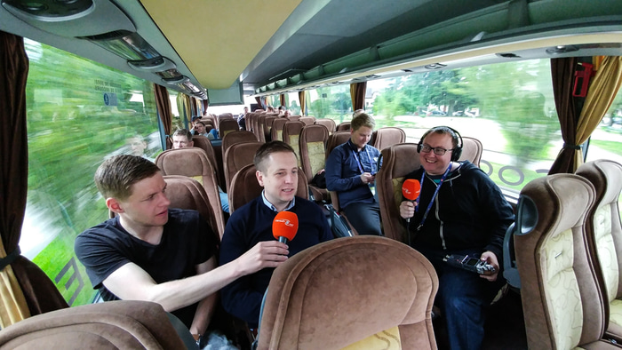 Allar lausar stundir eru nýttar til að vinna fréttaefni. Hér eru ritstjórarnir að taka upp Innkastið í langri rútuferð í Frakklandi síðasta sumar.