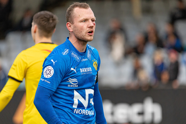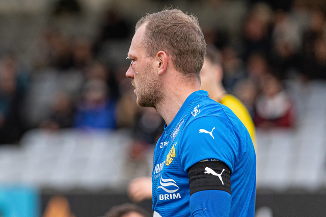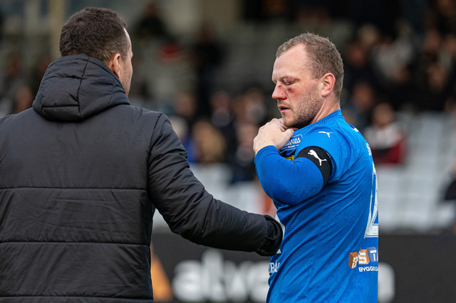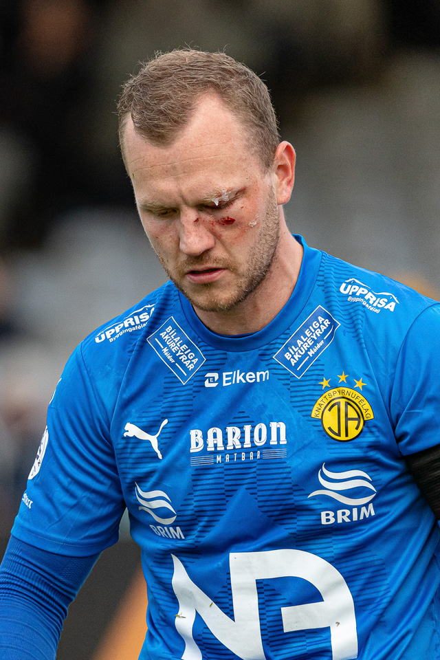 „Árni Snær, markmaður ÍA, liggur eftir í teig ÍA. Vildi fá brot dæmt! Takkarnir á Finni Tómasi enduðu í andliti Árna og það fossblæðir úr andliti markmannsins. Algjört óviljaverk," skrifaði Sæbjörn Steinke í textalýsinguna á Fótbolta.net.