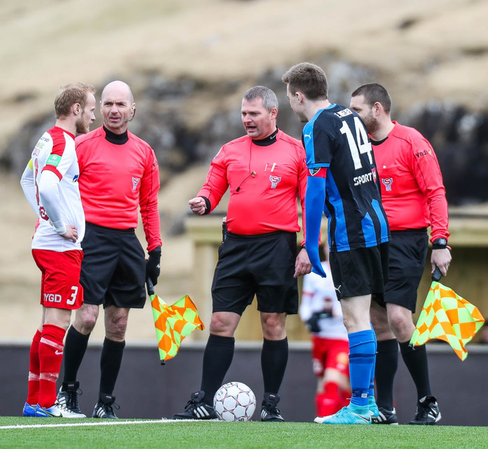 Í leik Grindavíkur og Leiknis dæma tveir Danir. Dómari verður Frederik Veis Svendsen sem dæmt hefur í dönsku B-deildinni. Andreas Bögbjerg Holt verður annar af aðstoðardómurunum.