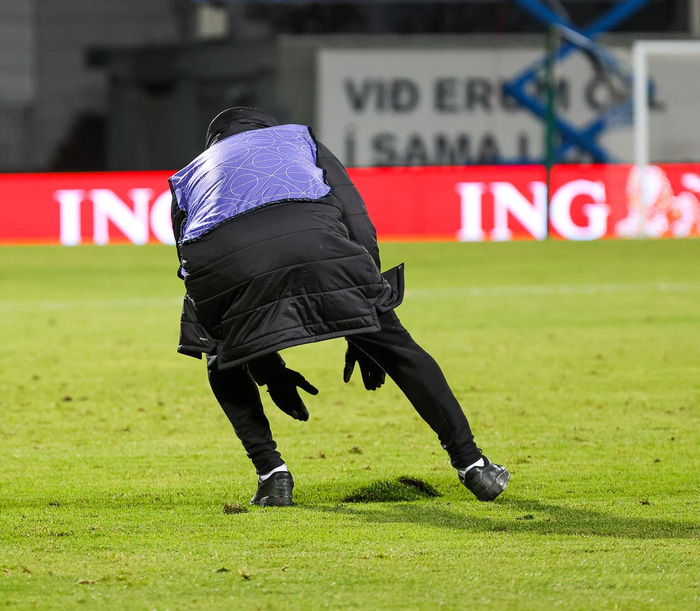 Þrisvar sinnum gerðist það í 1 - 2 tapi Íslands gegn Belgum á Laugardalsvelli í gær að vallarstarfsmenn ruku inn á völlinn í miðjum leik.